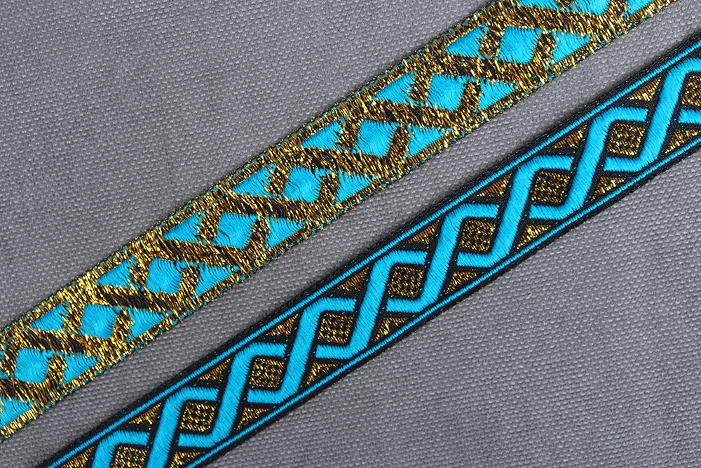 Тесьма жаккардовая 20мм №26 Орнамент Черный/Голубой/Т.Золото