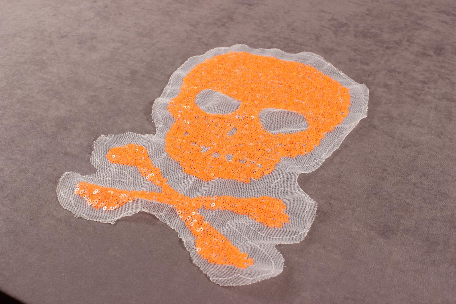 Аппликация пришивная 150*225мм с пайетками на сетке Череп Оранжевый неон/белый