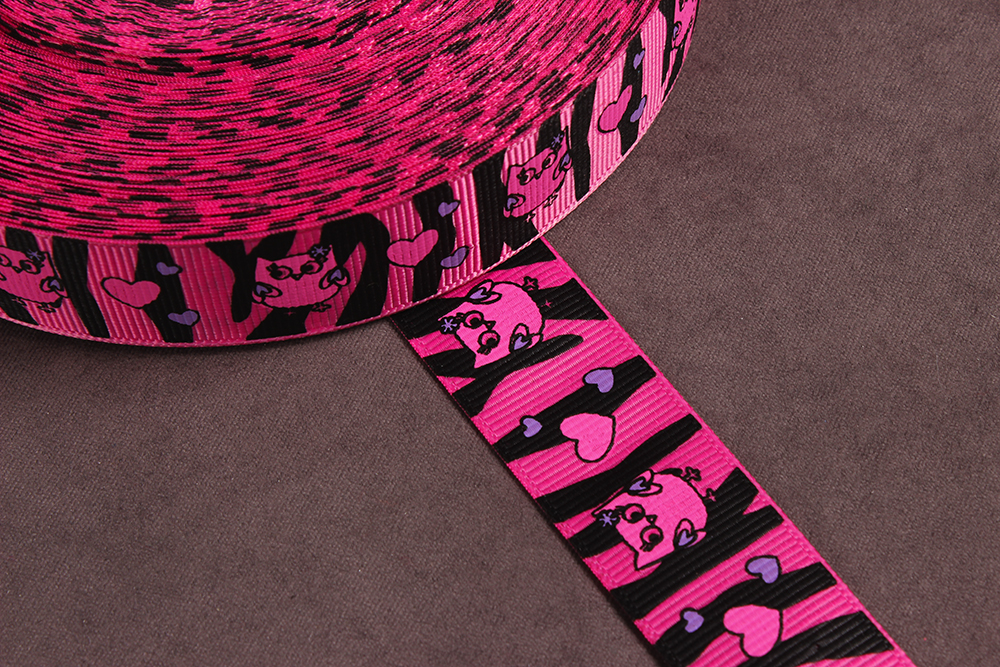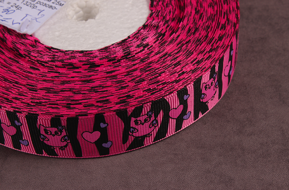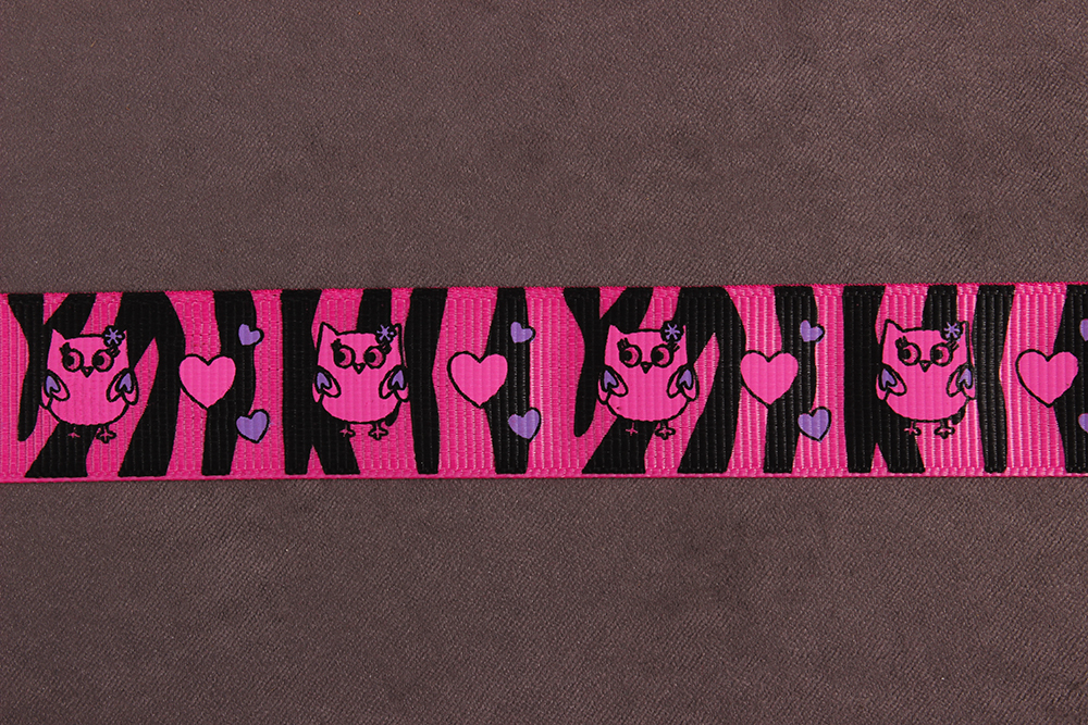 Репсовая лента с рисунком 25мм Совы на розово-черном