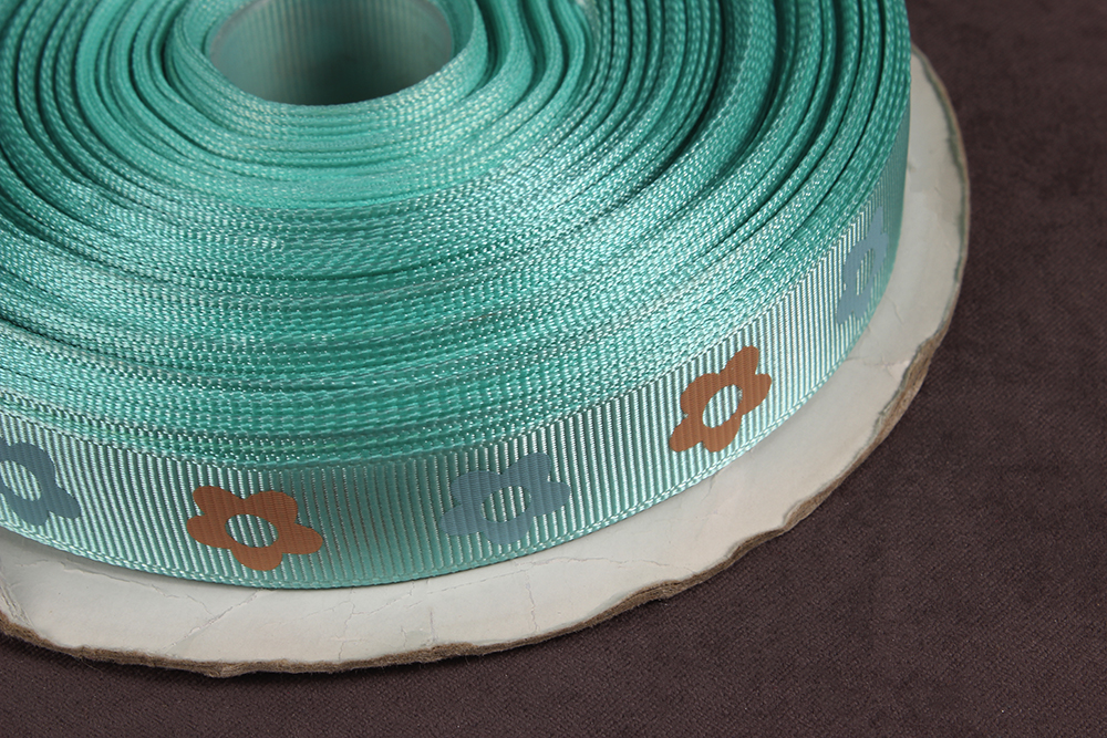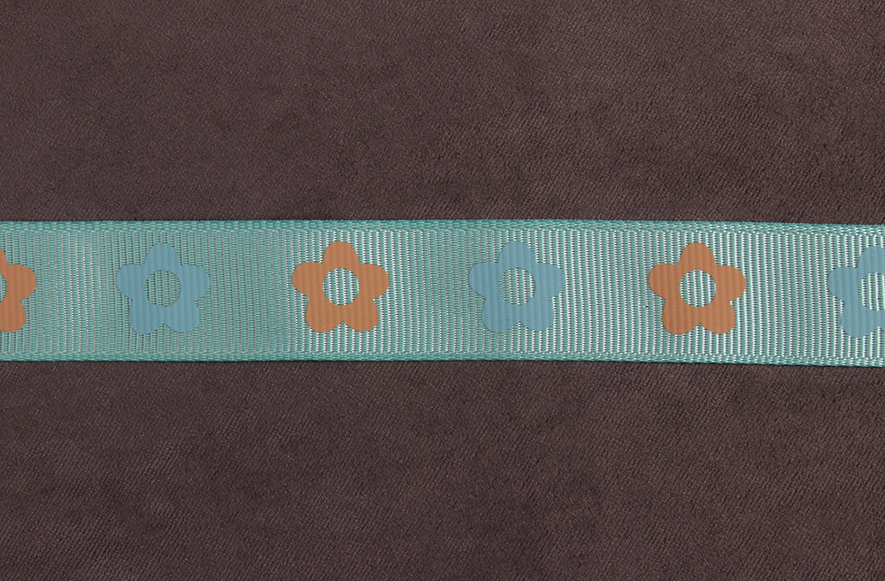 Репсовая лента с рисунком 20мм Персиковые/голубые цветы на мятном
