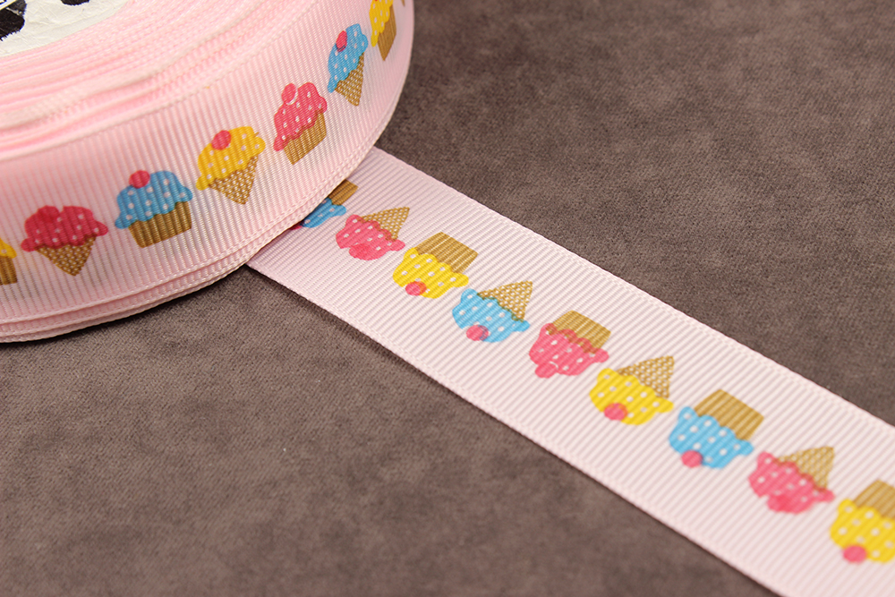 Репсовая лента с рисунком 25мм Мороженое/пироженое на розовом