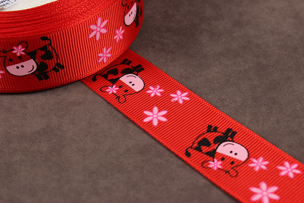 Репсовая лента с рисунком 25мм Корова Красный/черный/розовый