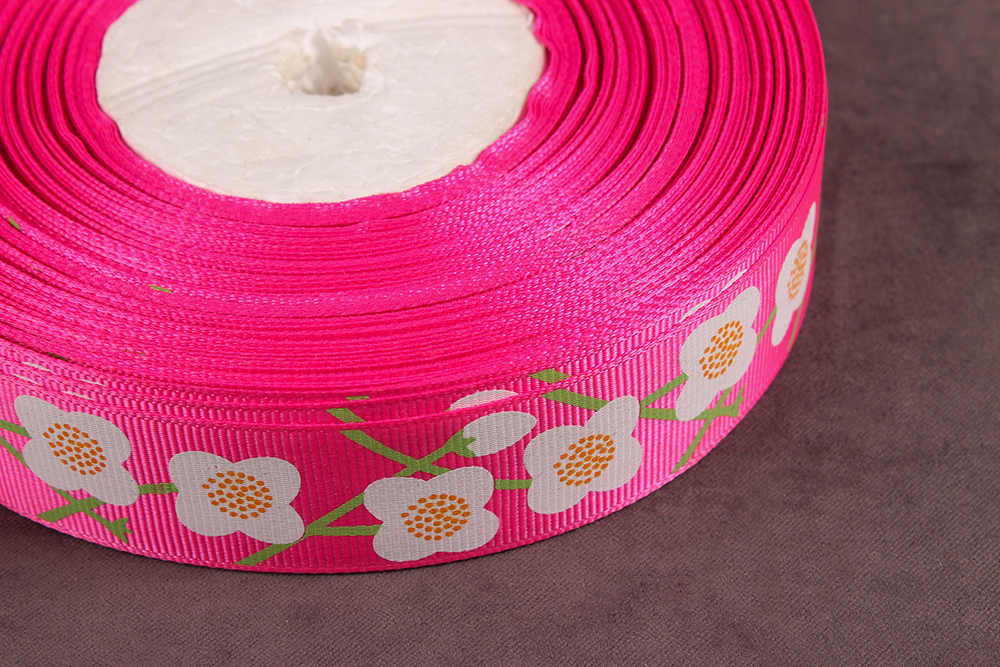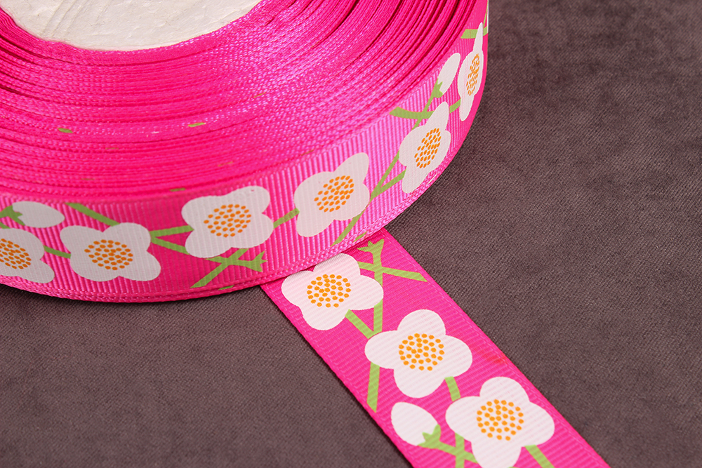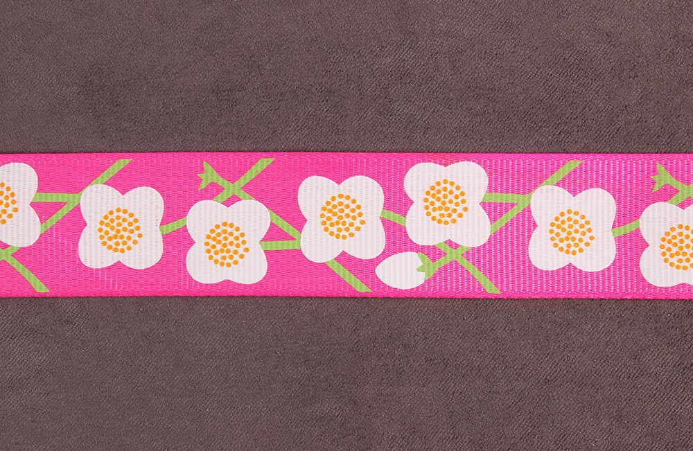 Репсовая лента с рисунком 25мм Цветы Яр.розовый/белый/зеленый/оранжевый