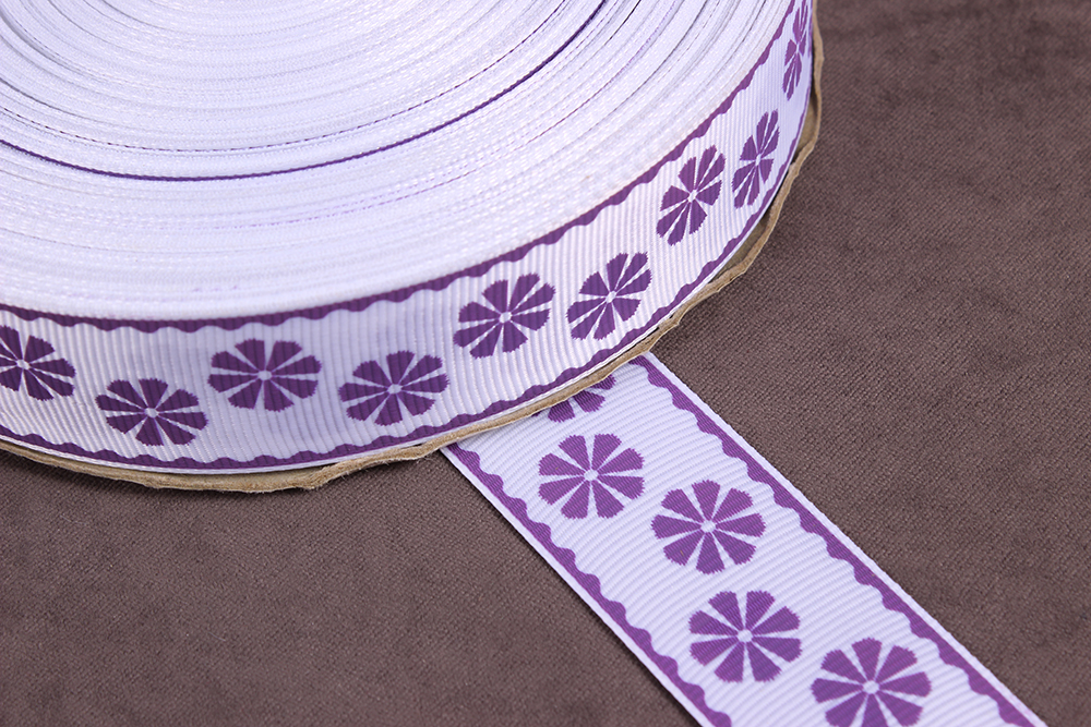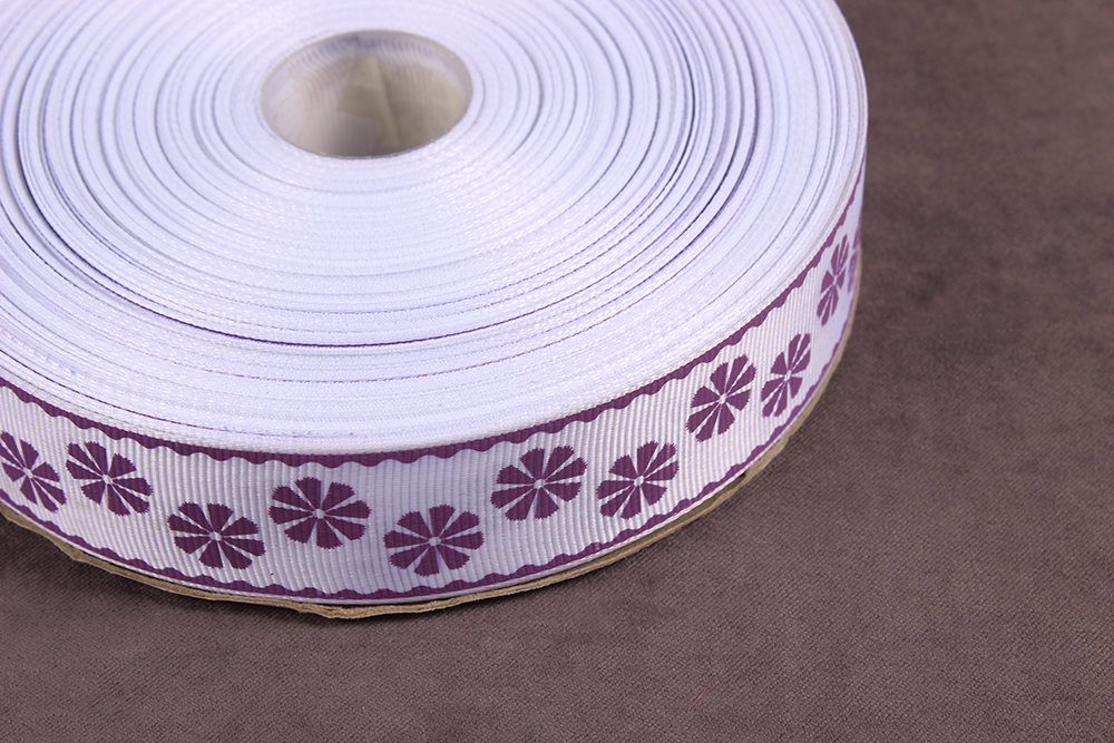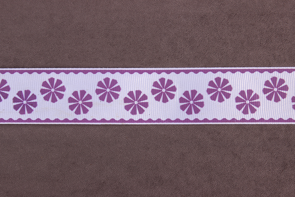 Репсовая лента с рисунком 25мм Цветы Белый/аметистовый
