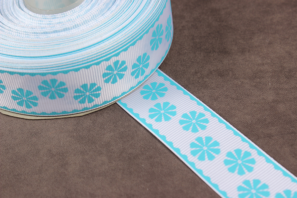 Репсовая лента с рисунком 25мм Цветы Белый/голубой