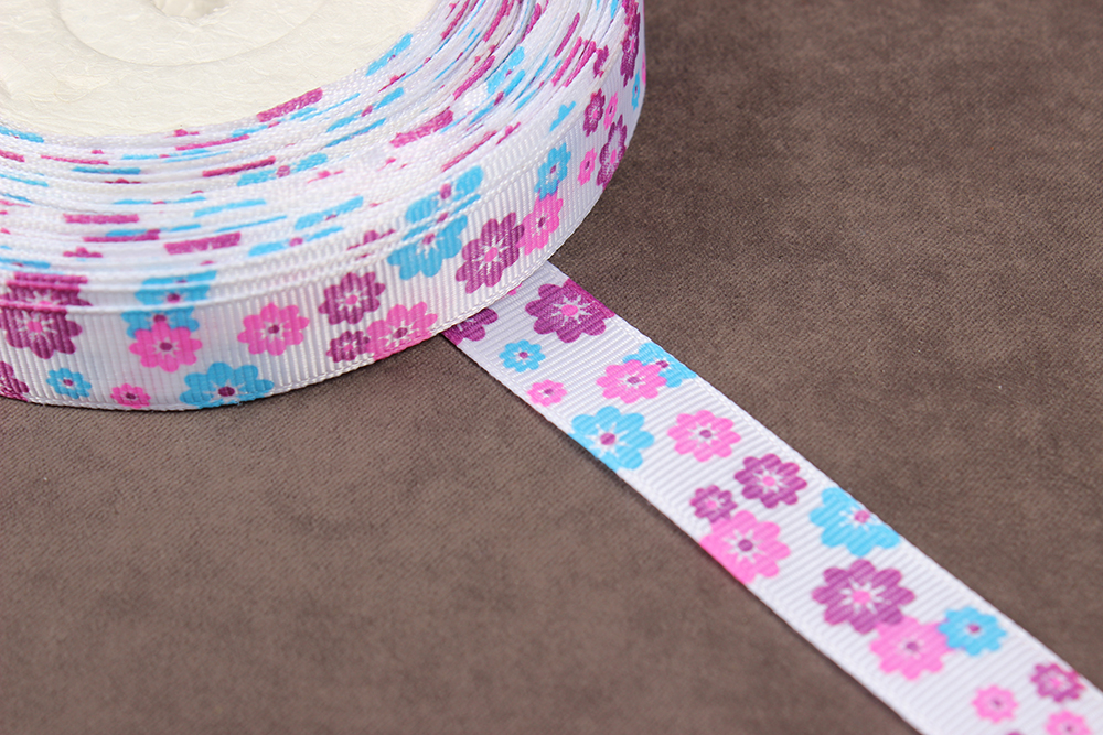 Репсовая лента с рисунком 15мм Цветы Белый/голубой/розовый/фиолетовый