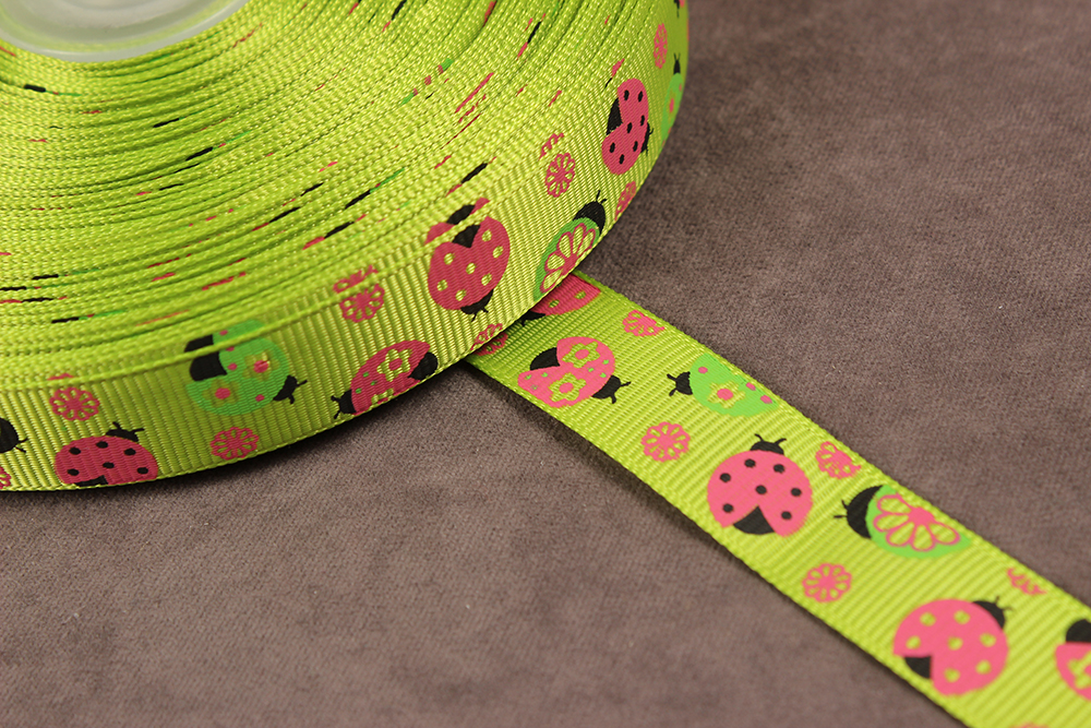 Репсовая лента с рисунком 15мм Божья коровка Зеленый/розовый/черный