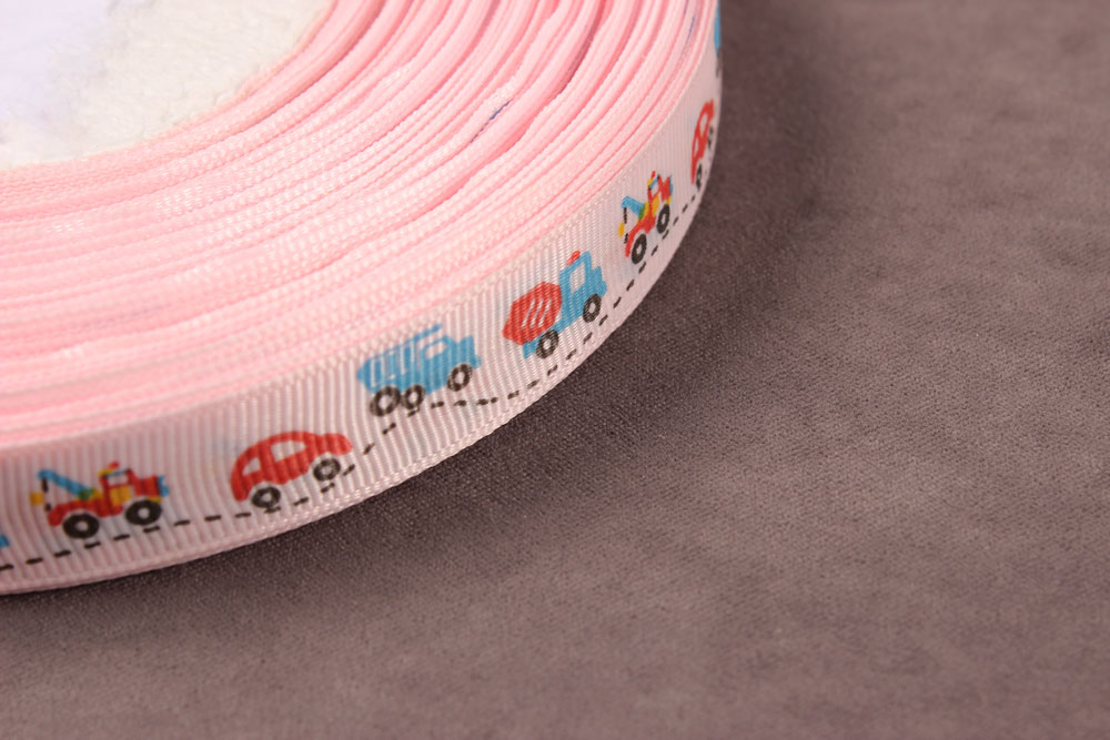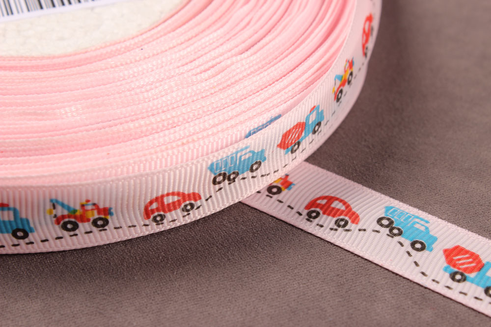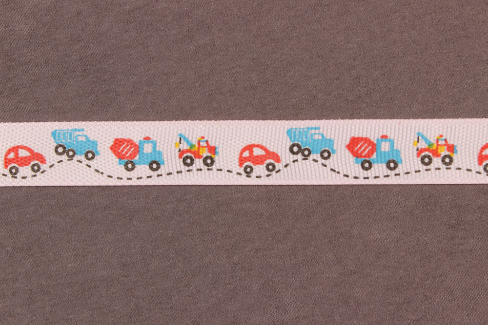 Репсовая лента с рисунком 15мм Машины Св.розовый/красный/голубой/черный