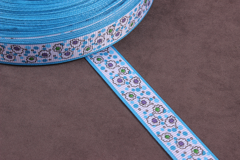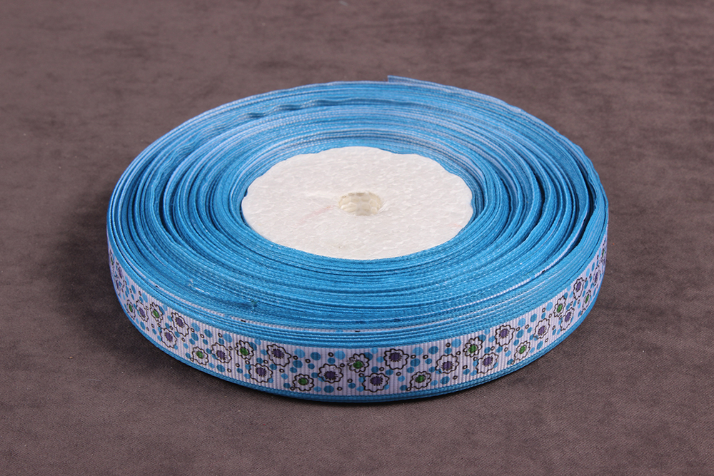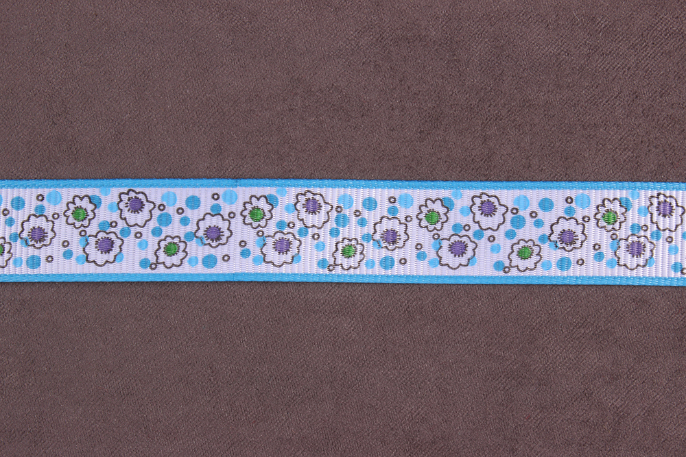 Репсовая лента с рисунком 15мм Цветы Белый/голубой/зеленый/черный