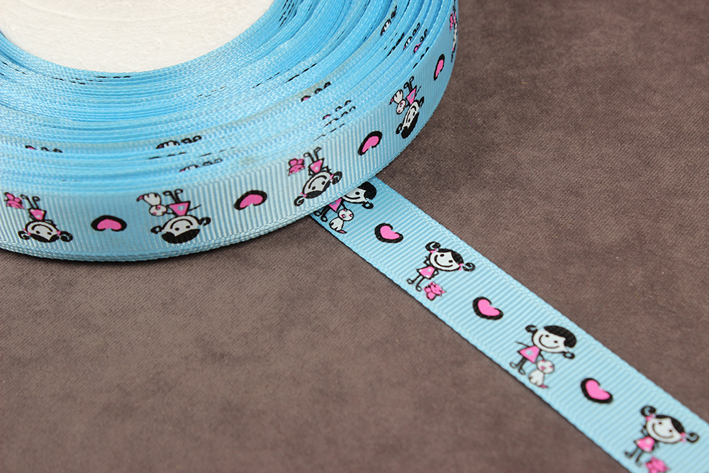 Репсовая лента с рисунком 15мм Куклы Голубой/розовый/черный/белый