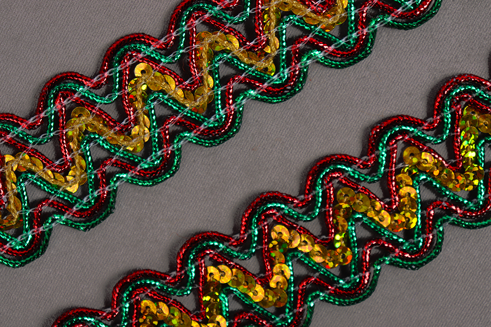 Тесьма 30мм с пайетками Зиг-заг Красный/зеленый/золото