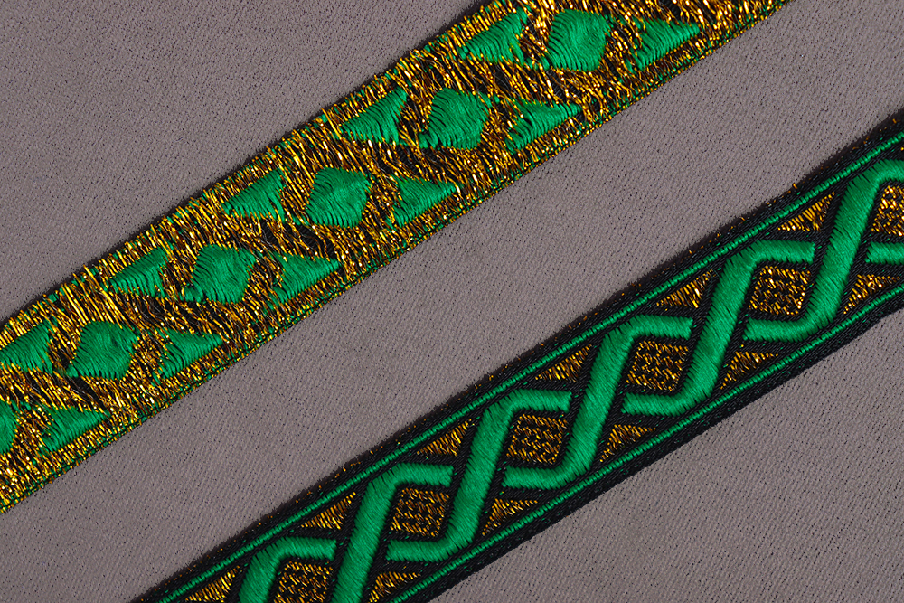 Тесьма жаккардовая 20мм Орнамент №28 Зеленый/Т.Золото/Черный