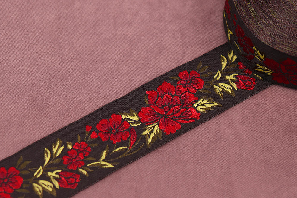 Тесьма 35мм жаккардовая Пионы Черный/Красный/Зеленый