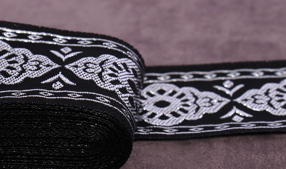 Тесьма жаккардовая 33мм Узоры рис.3 Черный/Серебро