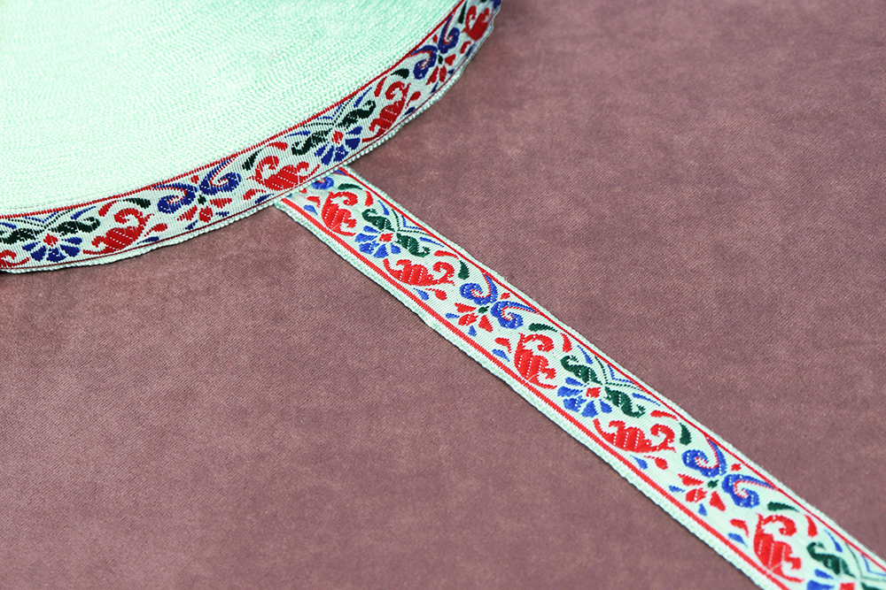 Лента 17мм жаккардовая 9119 Цветы Мятный/красный/синий/зеленый