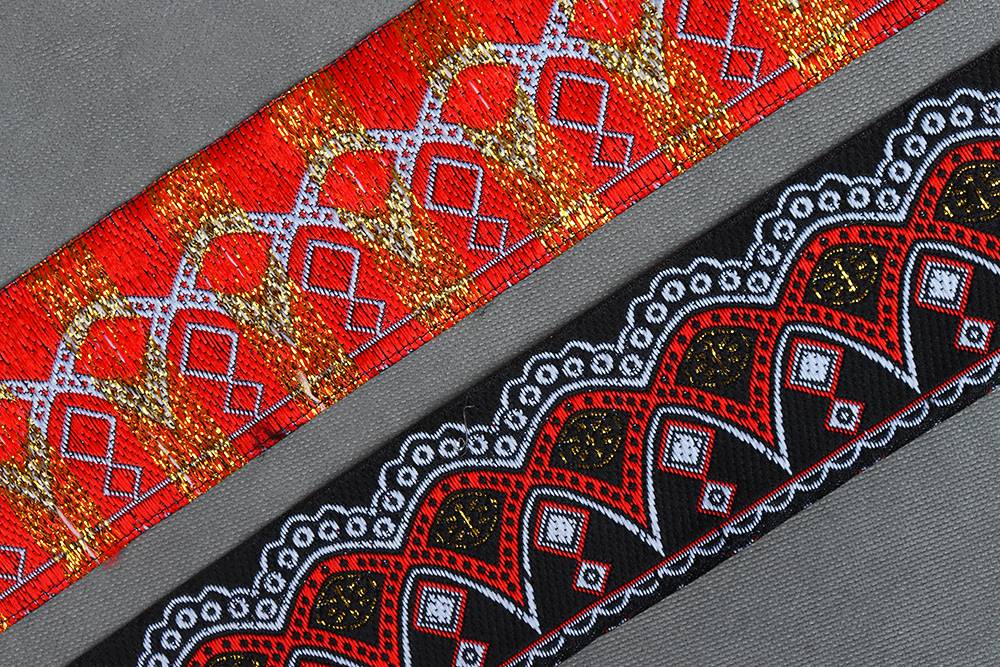 Тесьма жаккардовая 33мм Этнические узоры Красный/Золото