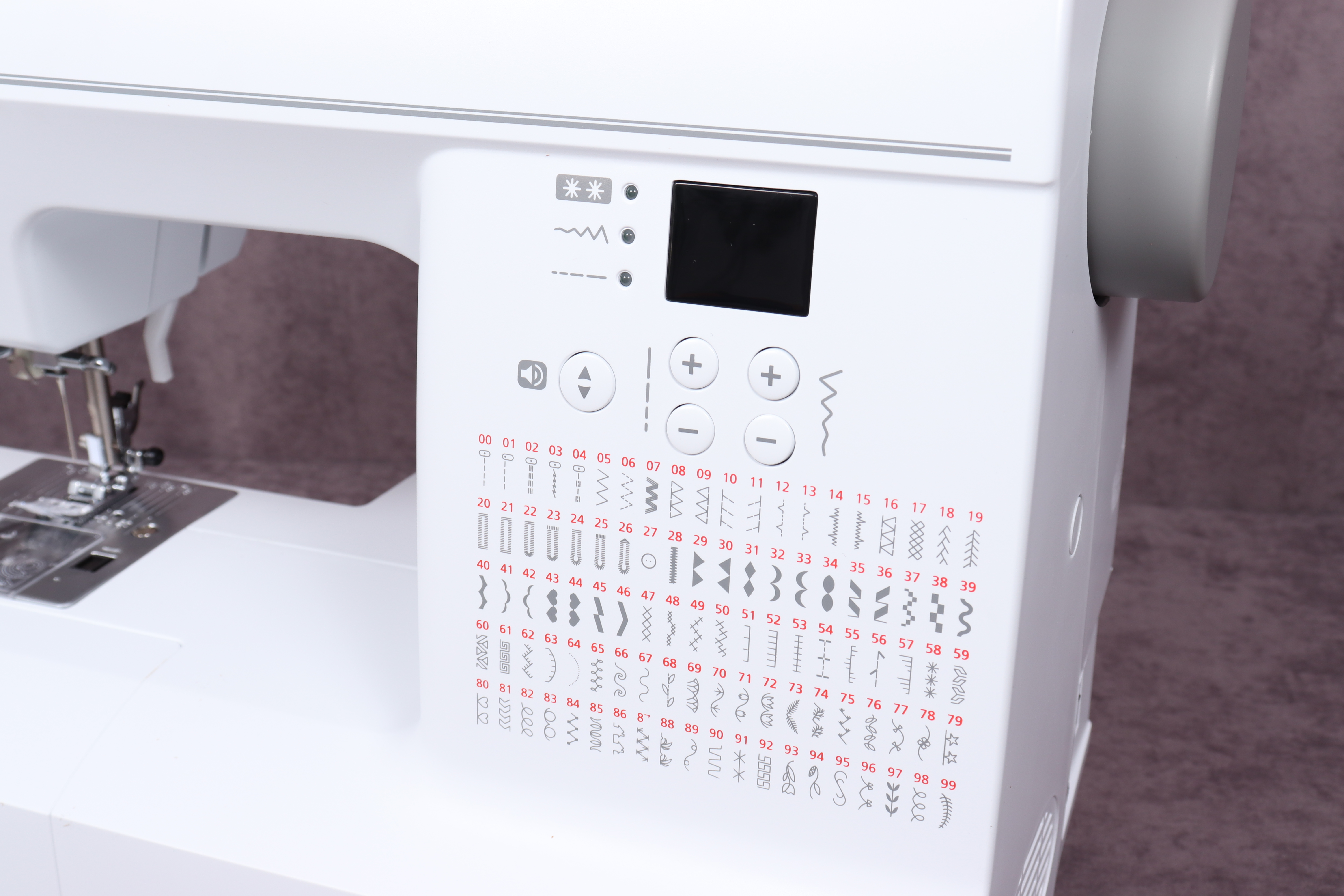 -100 швейных операций: прямая строчка (центральное и правое положение иглы), зигзаг, потайные строчки, оверлочные строчки, декоративные строчки, трикотажные строчки, петля-автомат - 7 видов;